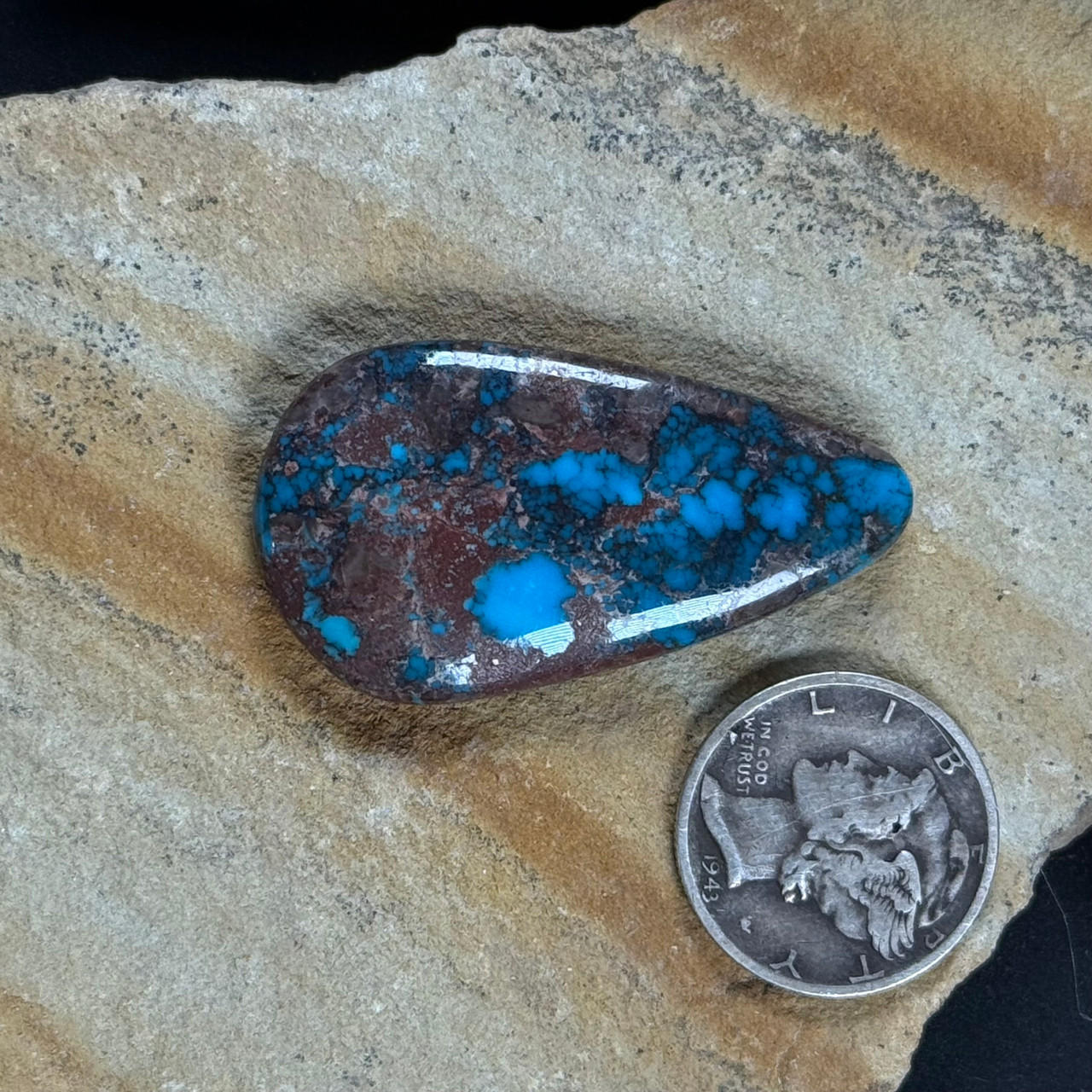 Here is a spectacular royal blue Bisbee Turquoise cab with heavy chocolate to red matrix including a beautiful Bisbee Blue heart. It was hand cut by John Hartman and is 100% natural, it weighs 30 carats.